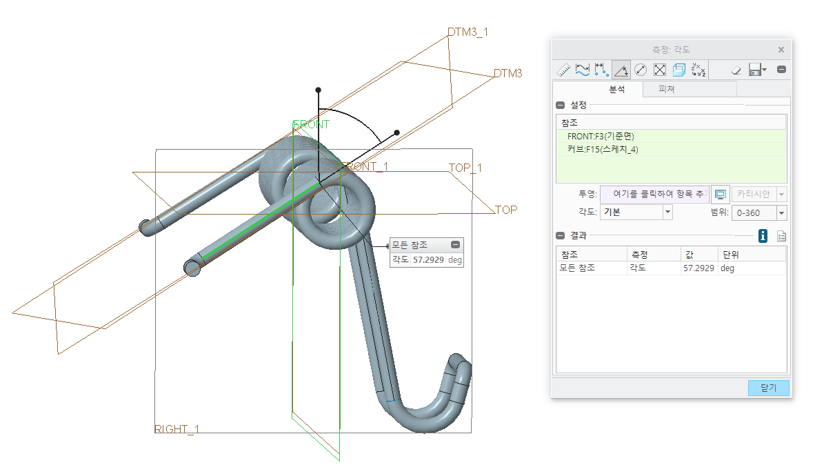 분석 > 측정 > 각도 Ctrl키를 누른 상태에서 FRONT 기준면과 커브:F15 선택 |