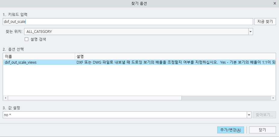 키워드 입력 창에 옵션명 'dxf_out_scale_views'를 입력합니다.