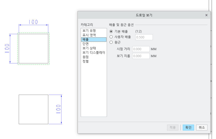 도면에서 처음 만든 보기에는 사용자 배율을 적용하지 말아야 합니다.