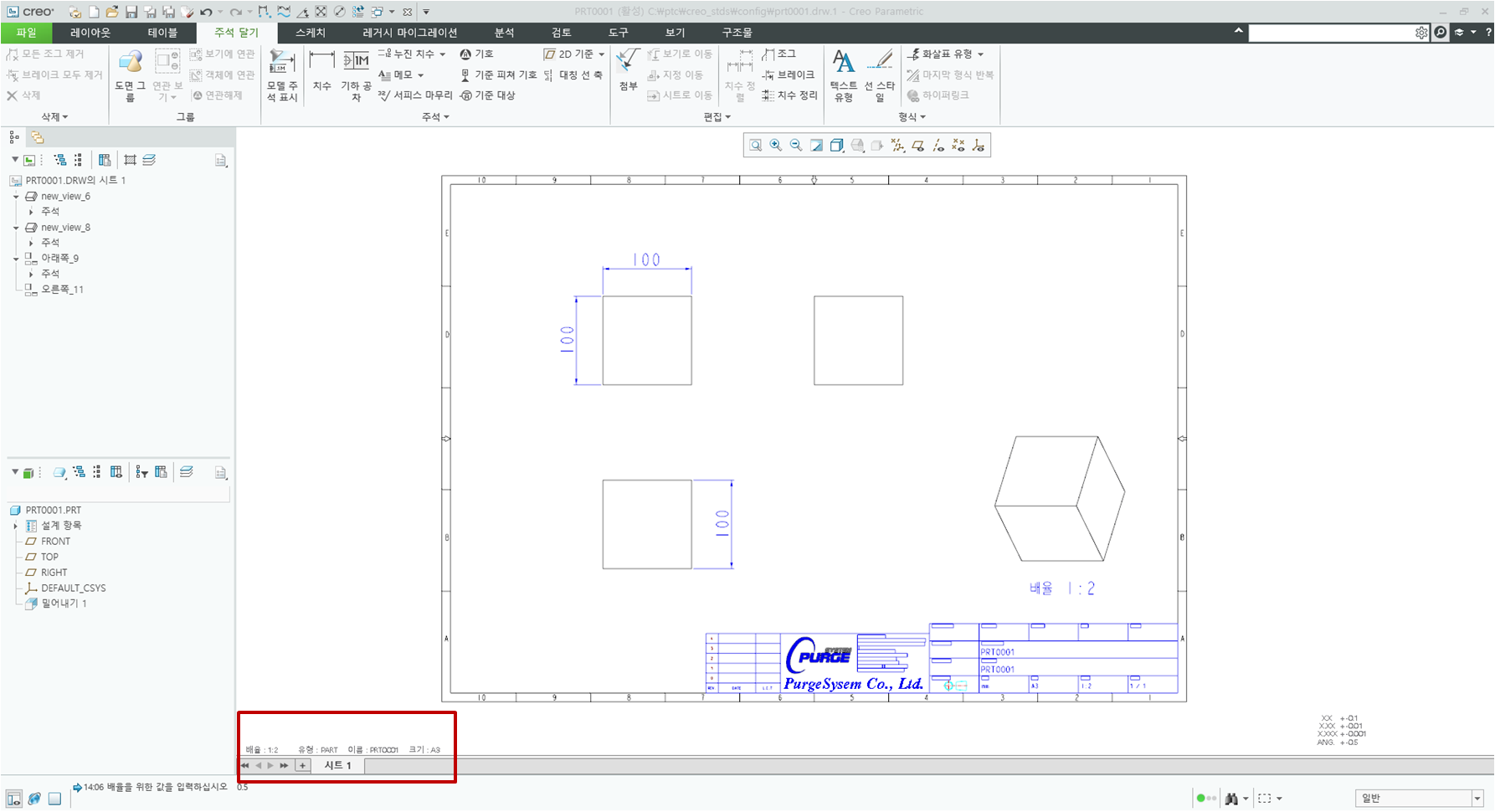 Creo에서 배율을 조정하면 항상 시트의 크기는 고정된 상태에서 보기(모델링 형상)의 크기가 변경됩니다.