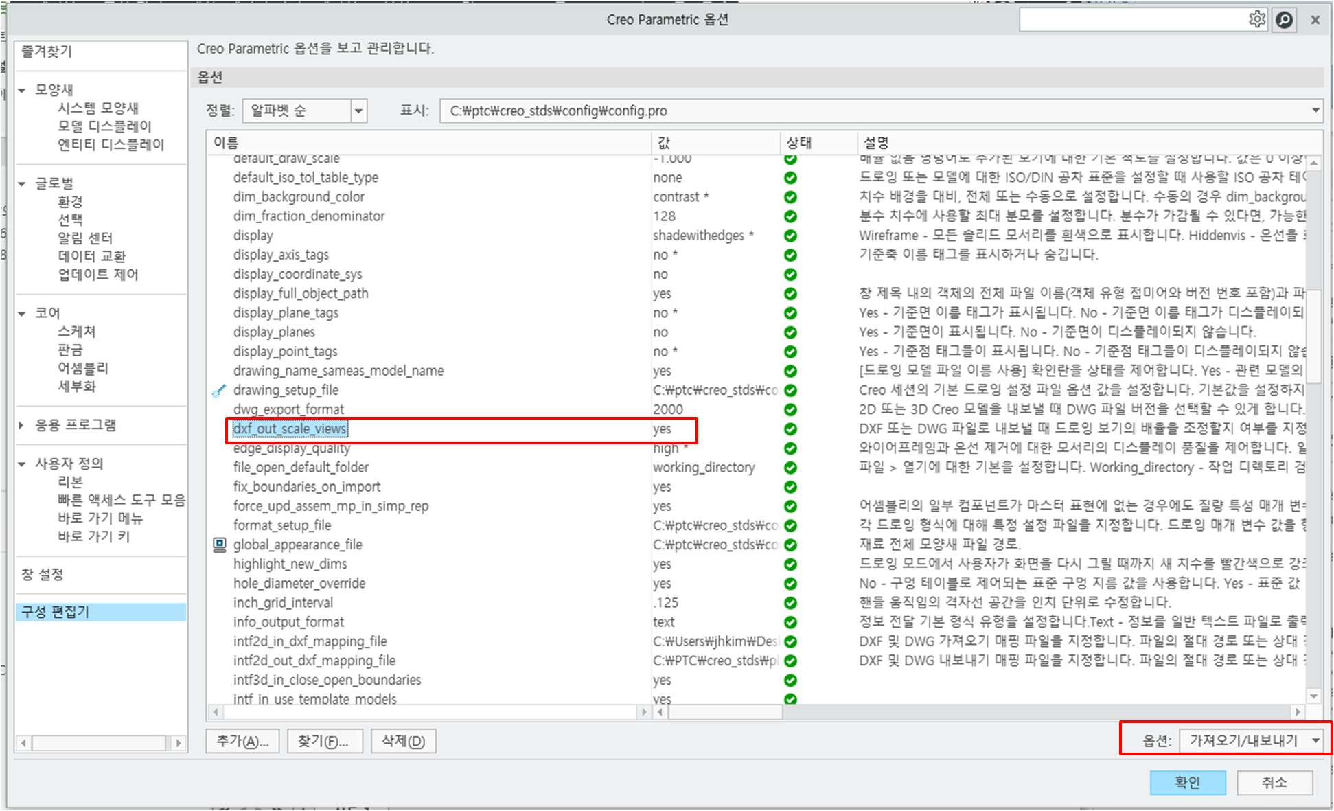 이제 옵션 창을 살펴보면 dxf_out_scale_views의 값이 yes로 변경된 것을 확인할 수 있습니다.