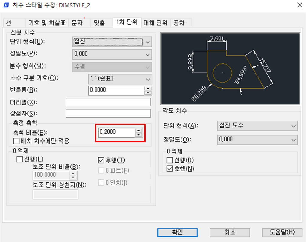 이 때 축적 비율이 0.2로 변경된 치수 스타일 이름이 dimstyle_2 라고 치겠습니다.