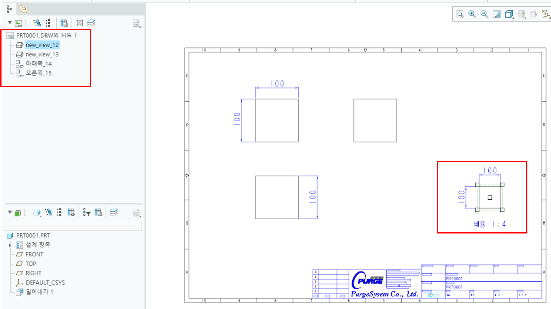 이 때 기본 보기가 1/4 배율의 보기로 인식된 상태라서, 해당 보기의 가로 치수가 100mm로 나간 것이죠.